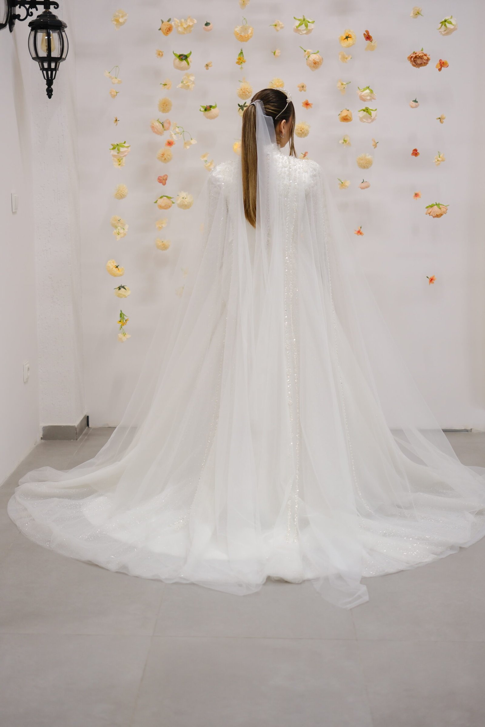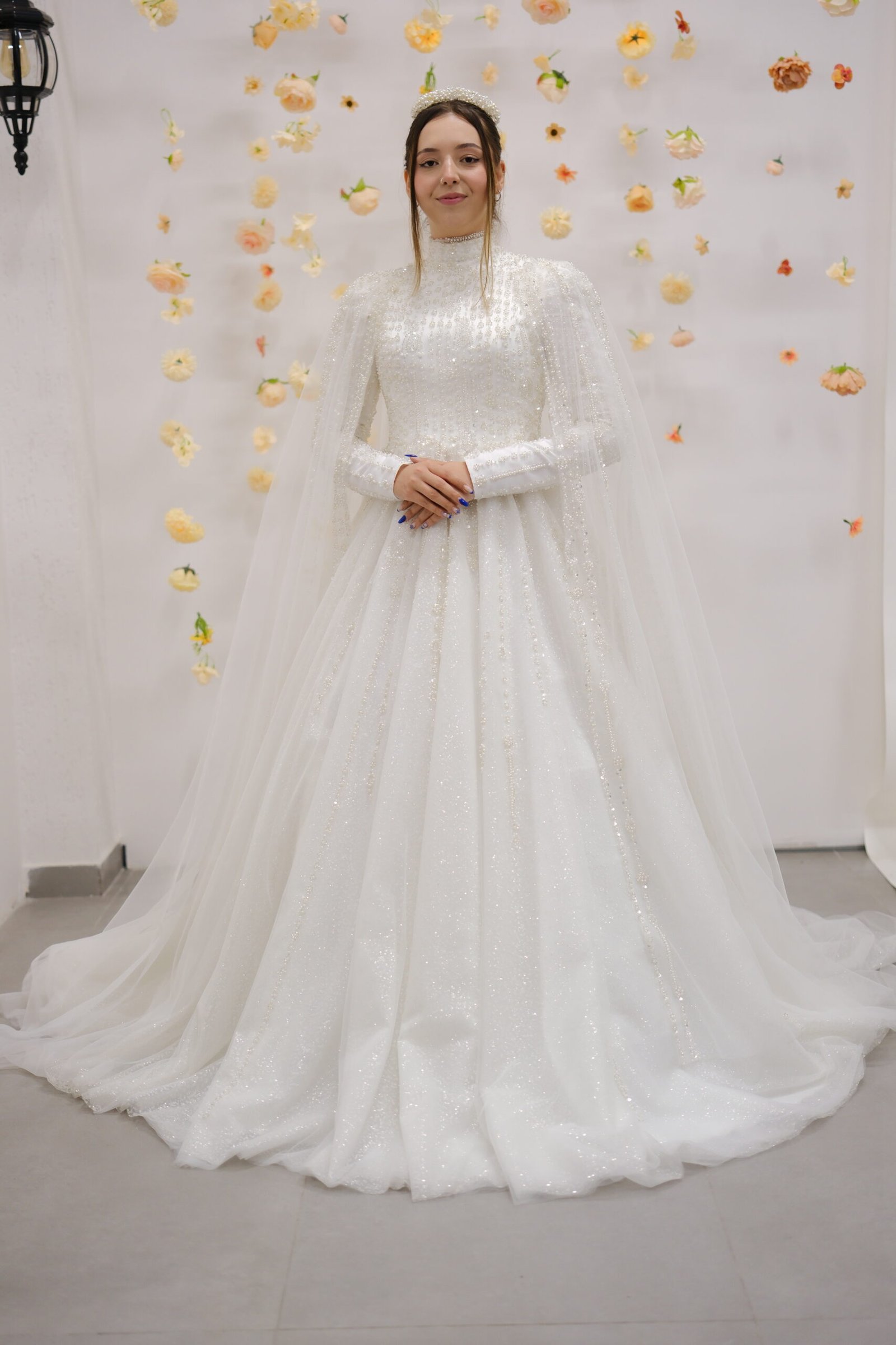 NOYA | IŞILTILI DANTEL YÜKSEK YAKA A KESİM GELİNLİK